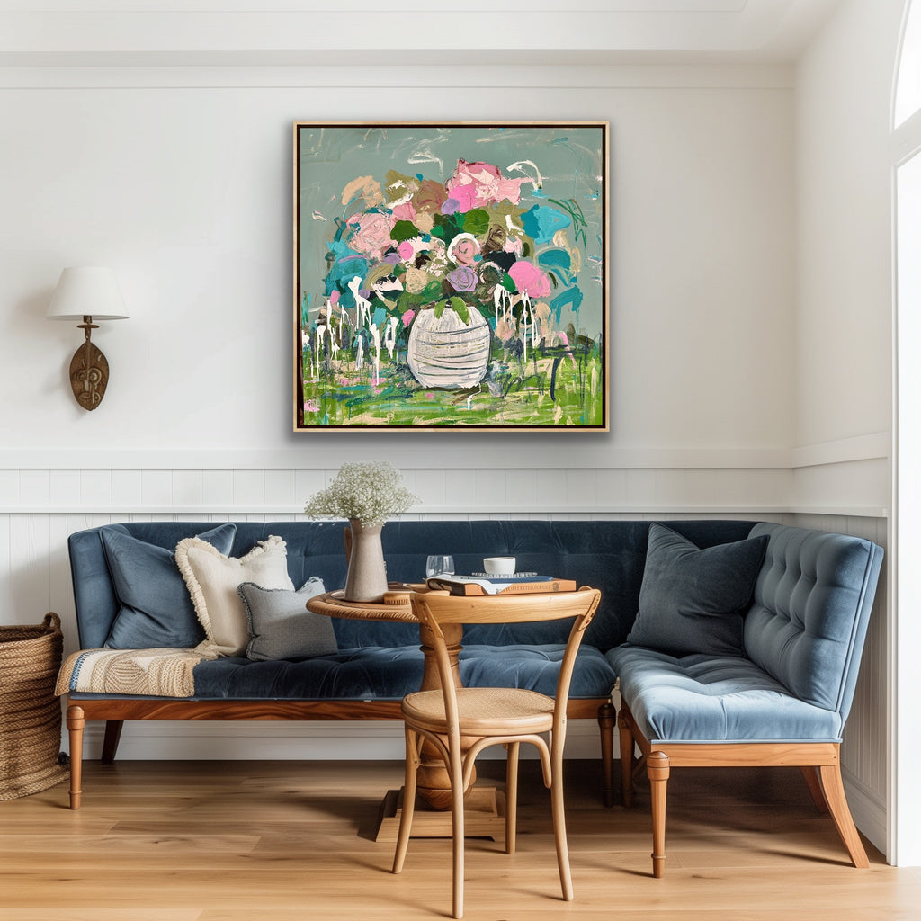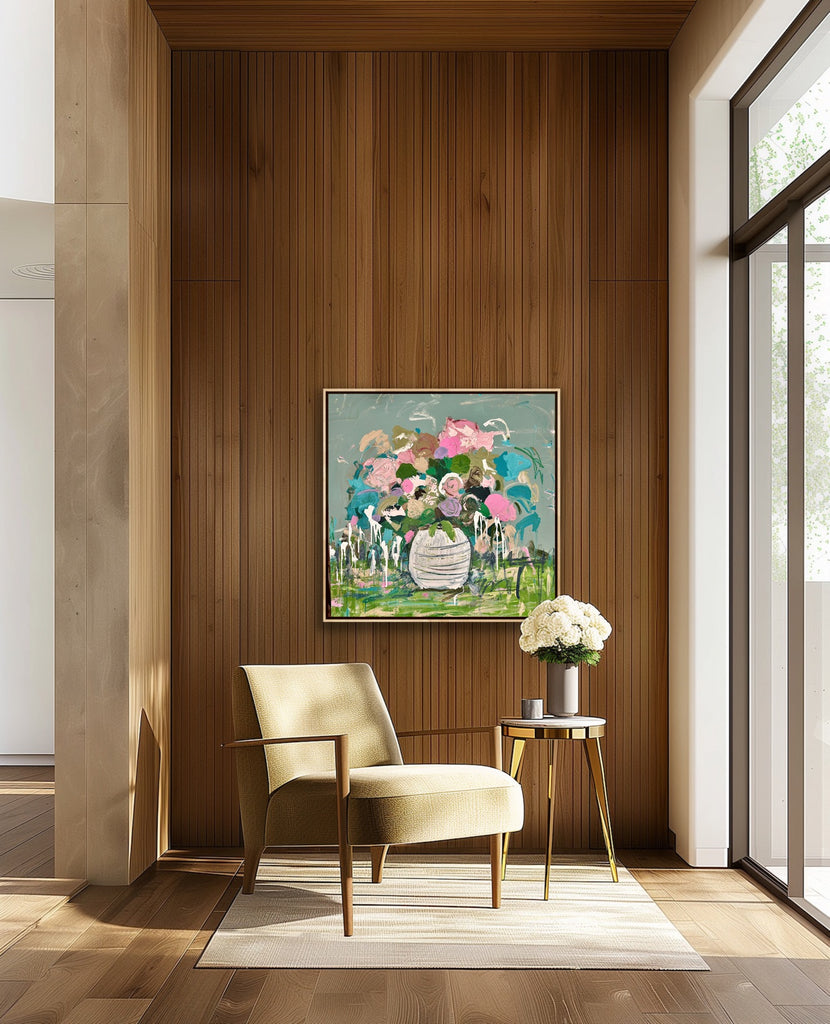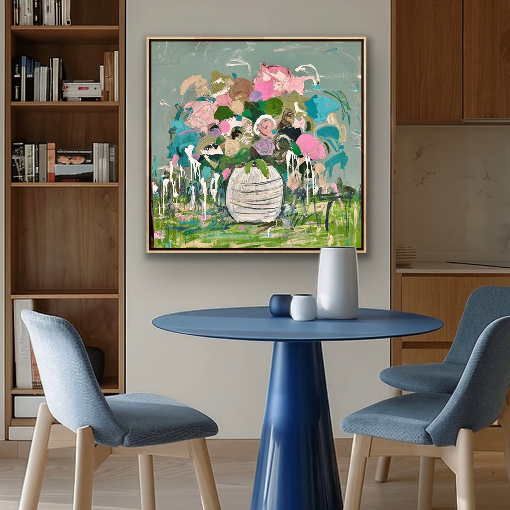 Painting comes unframed. Images showing framed painting are for mock up purposes only to provide the viewer with an idea as to what the painting will look like if framed in a shadow box frame (my personal preference is Oak however a White or Black shadow box frame will look good depending on your decor) if you have a preference for a framed piece.