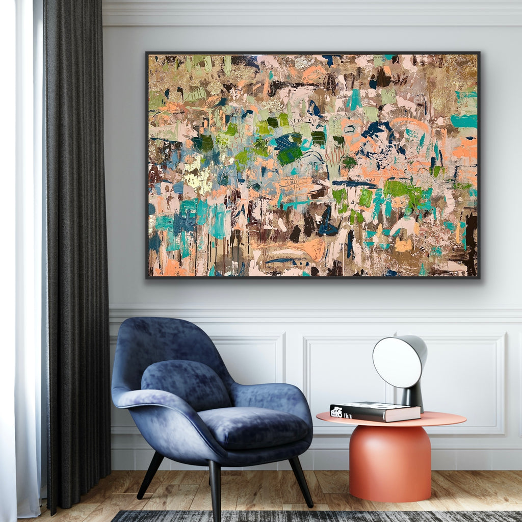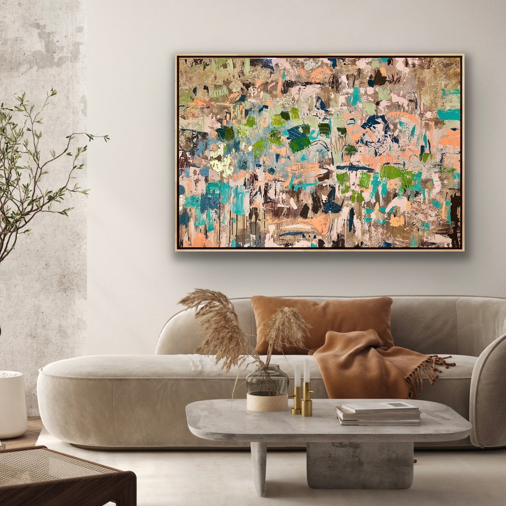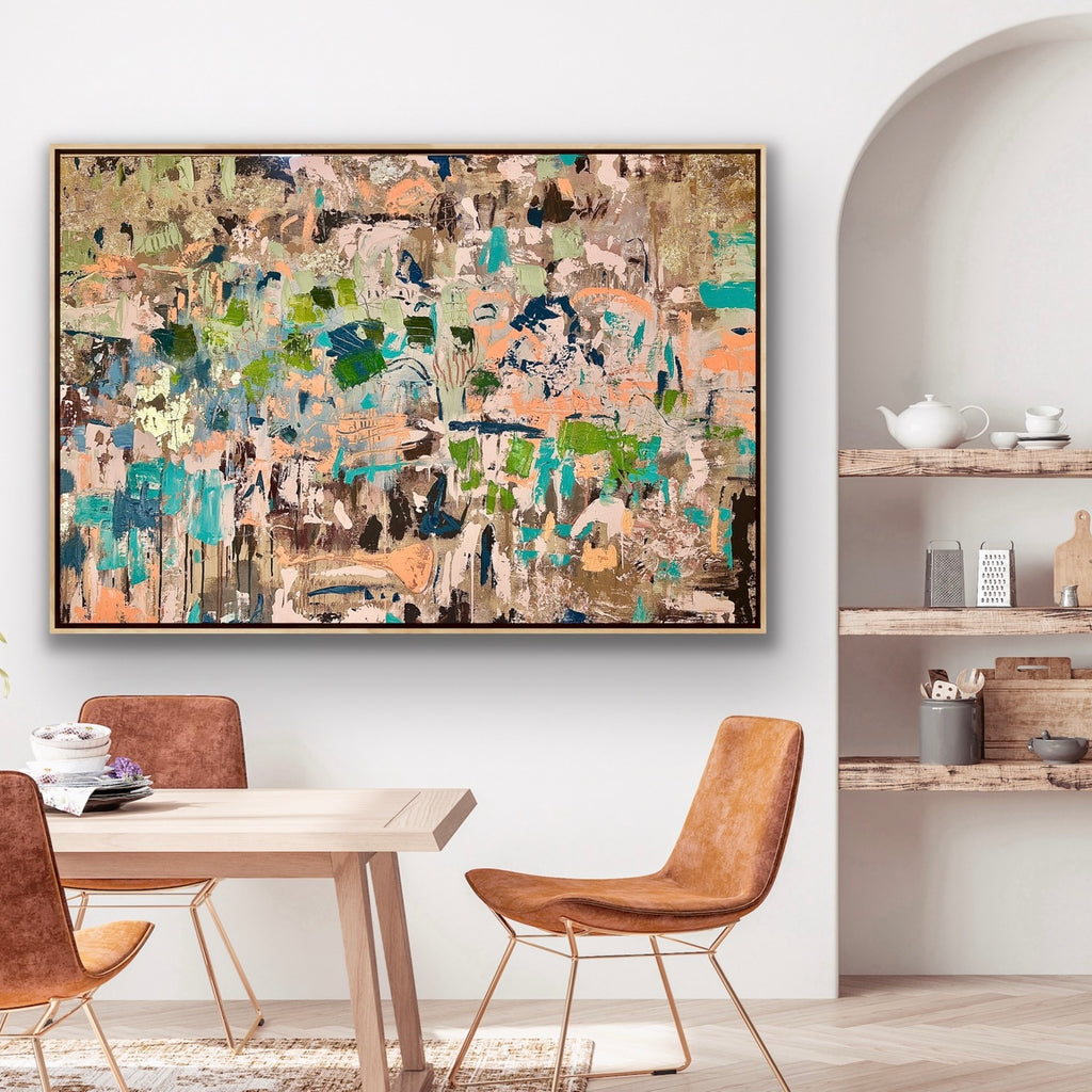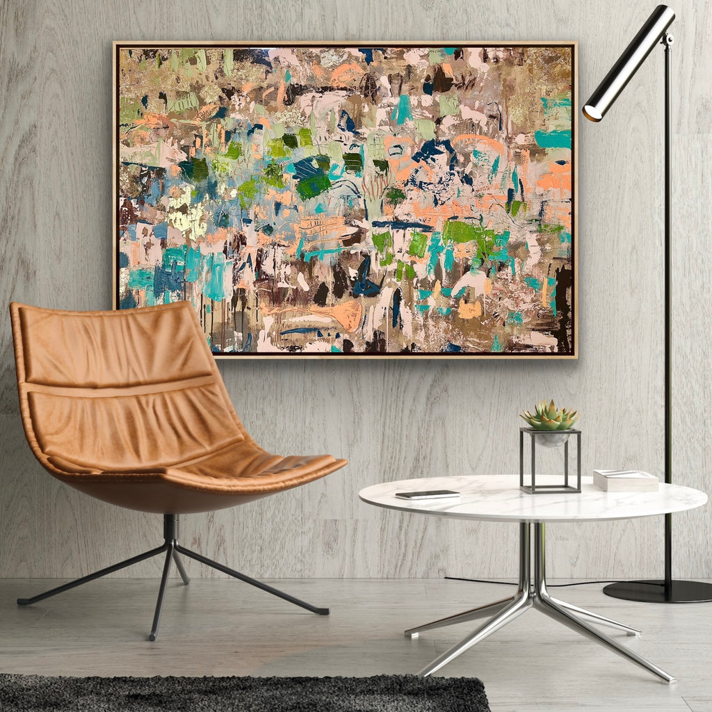 Painting comes unframed. Images showing framed painting are for mock up purposes only to provide the viewer with an idea as to what the painting will look like if framed in a shadow box frame (my personal preference is Oak however a White or Black shadow box frame will look good depending on your decor) if you have a preference for a framed piece.