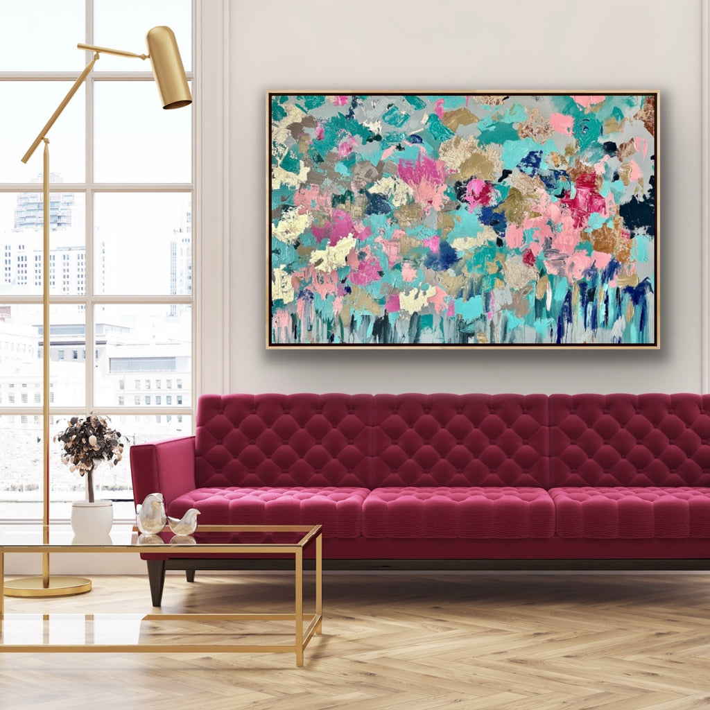 Painting comes unframed. Images showing framed painting are for mock up purposes only to provide the viewer with an idea as to what the painting will look like if framed in a shadow box frame (my personal preference is Oak however a White or Black shadow box frame will look good depending on your decor) if you have a preference for a framed piece.