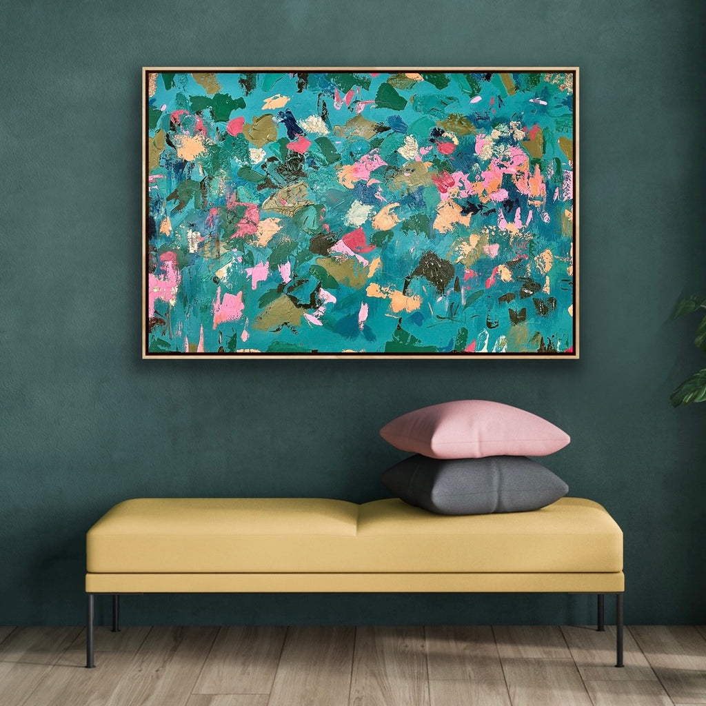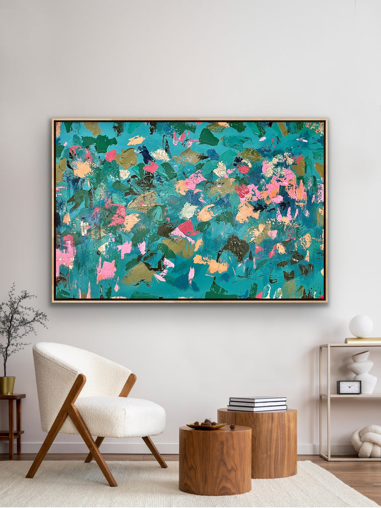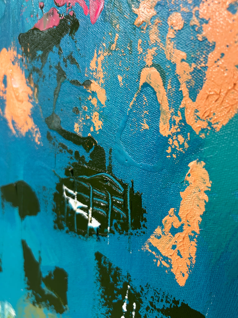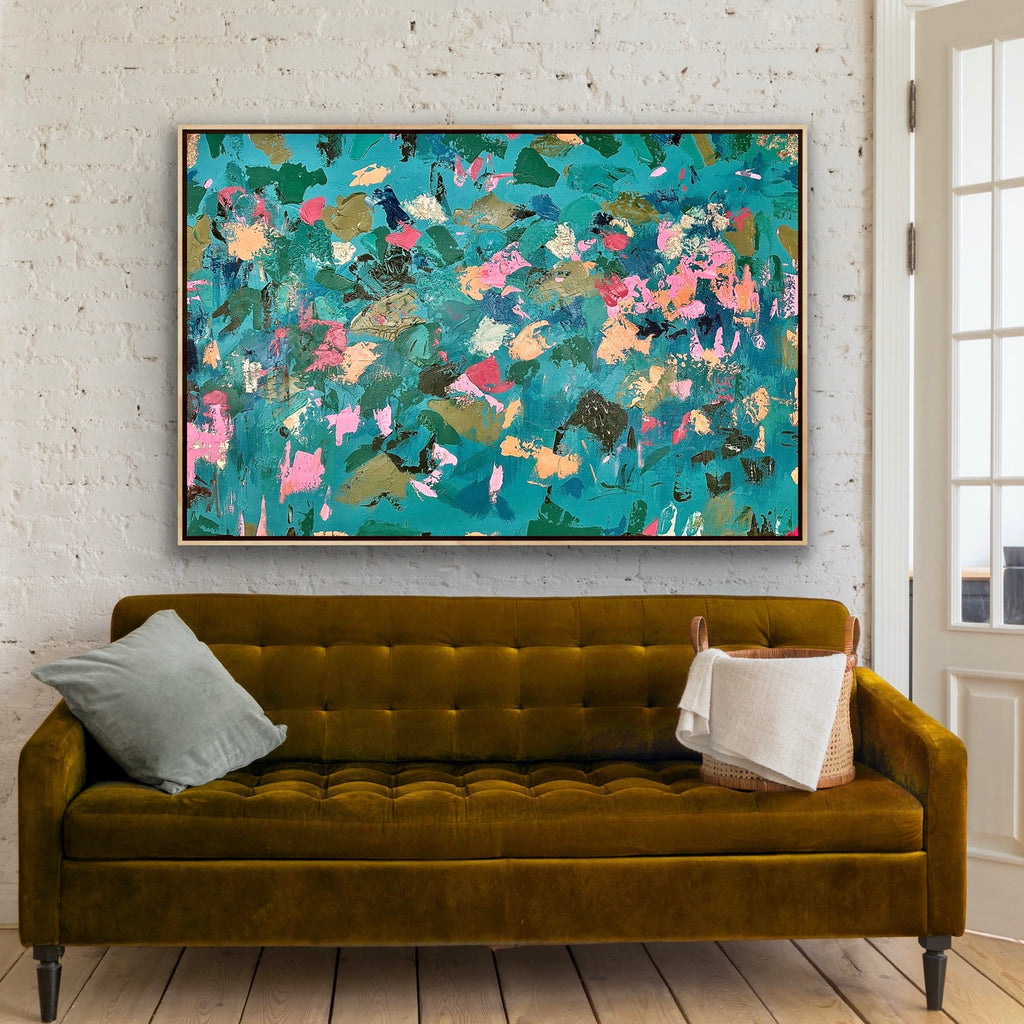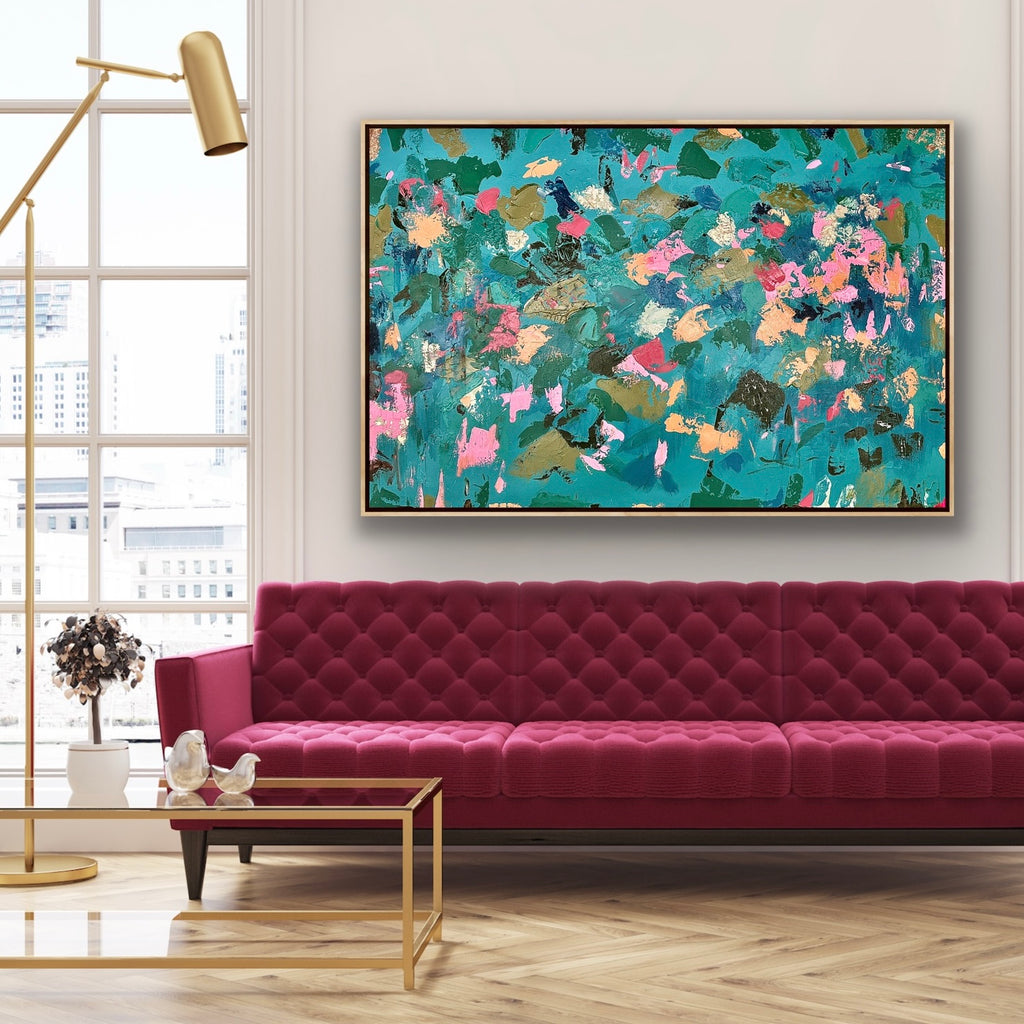 Painting comes unframed. Images showing framed painting are for mock up purposes only to provide the viewer with an idea as to what the painting will look like if framed in a shadow box frame (my personal preference is Oak however a White or Black shadow box frame will look good depending on your decor) if you have a preference for a framed piece.