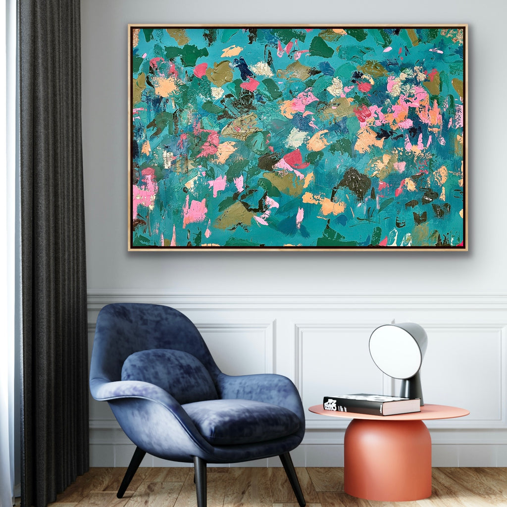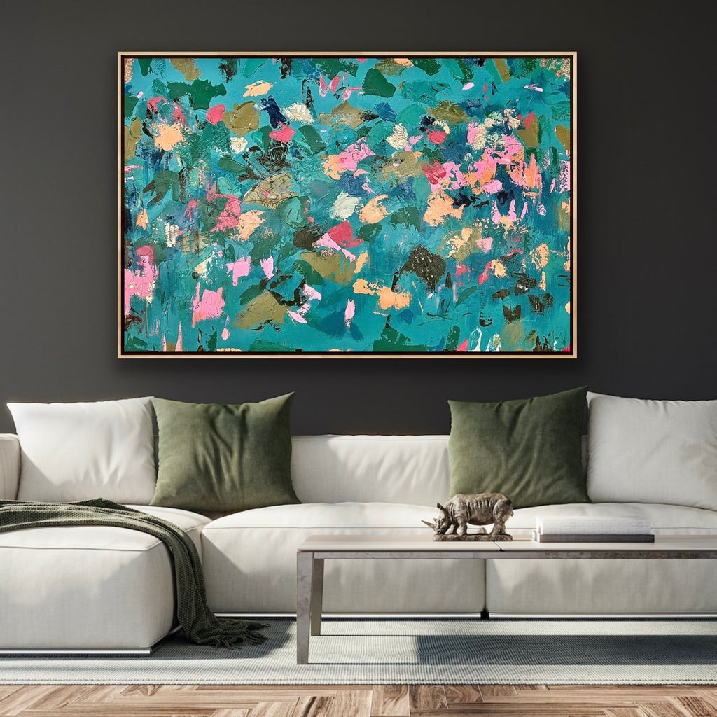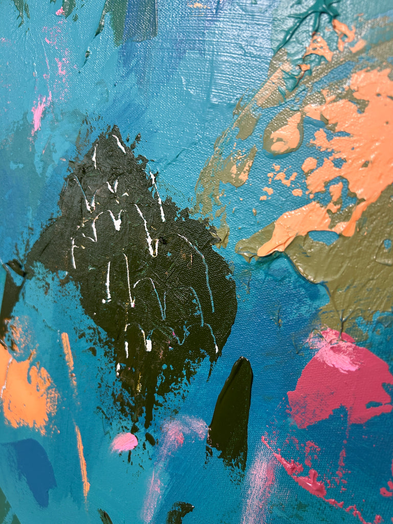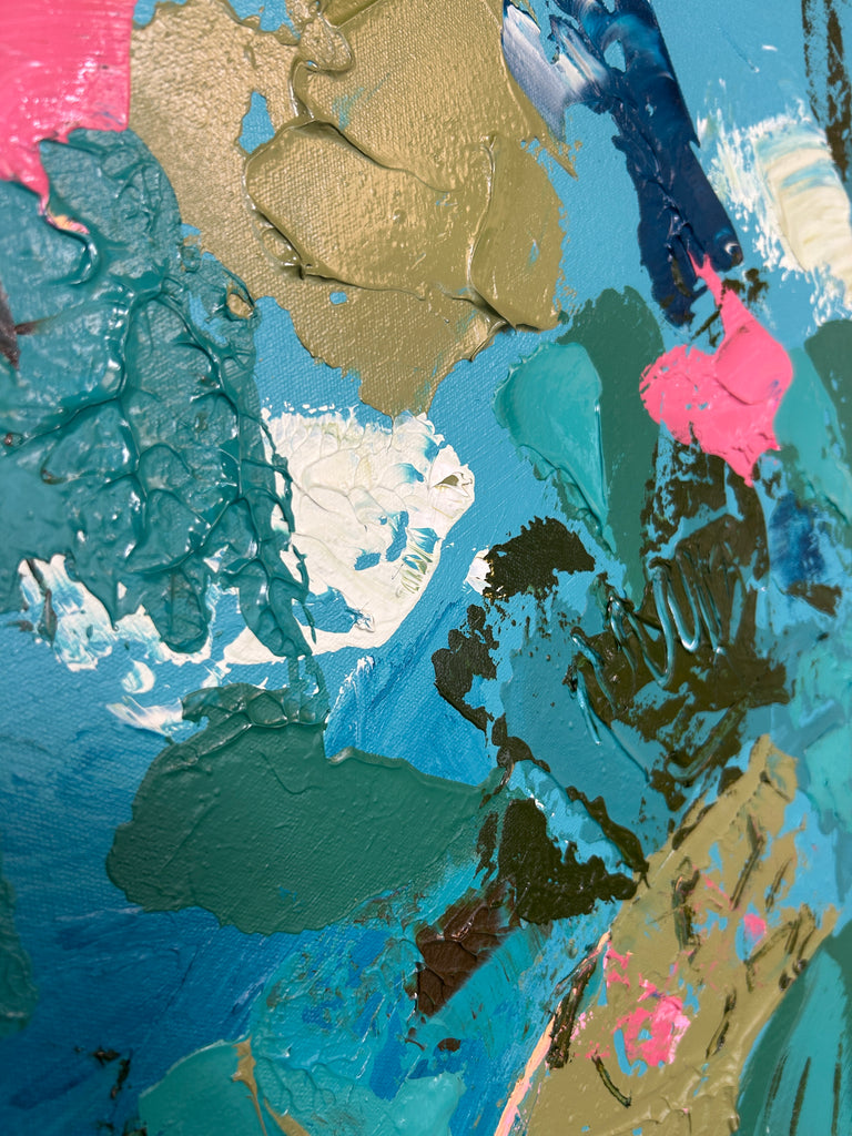 Painting comes unframed. Images showing framed painting are for mock up purposes only to provide the viewer with an idea as to what the painting will look like if framed in a shadow box frame (my personal preference is Oak however a White or Black shadow box frame will look good depending on your decor) if you have a preference for a framed piece.