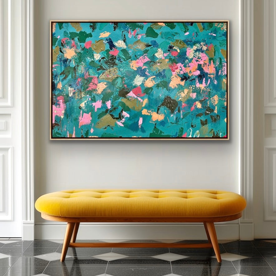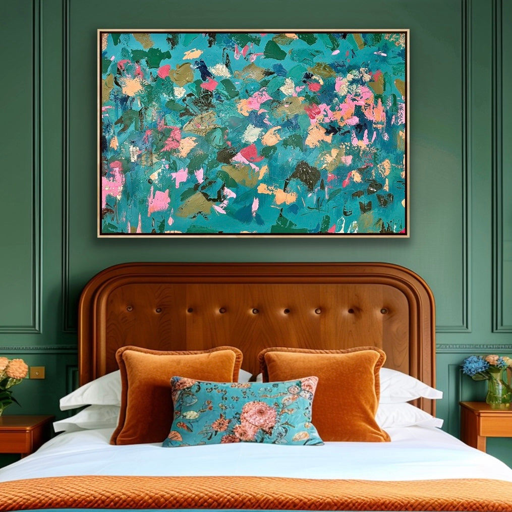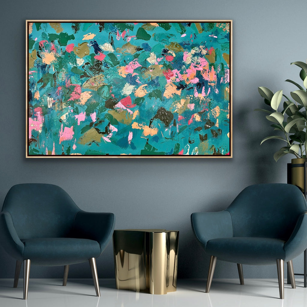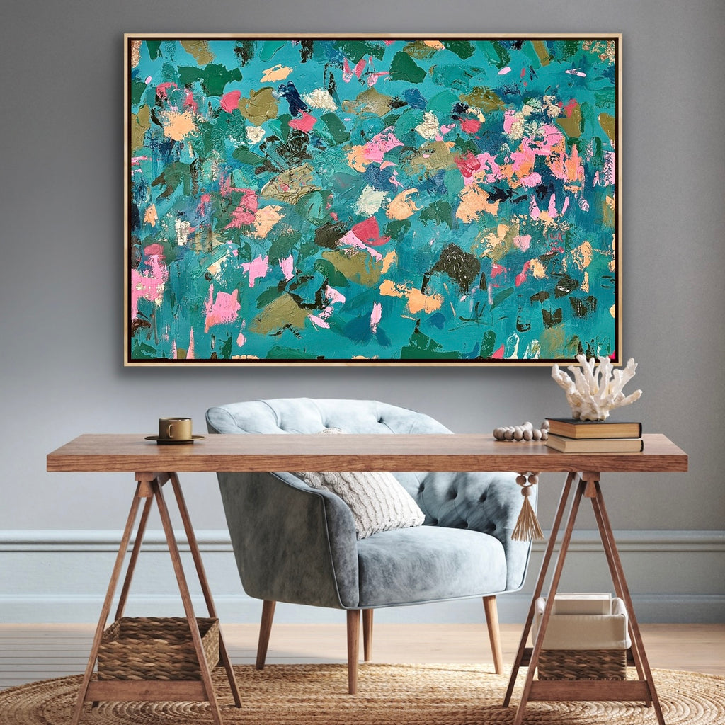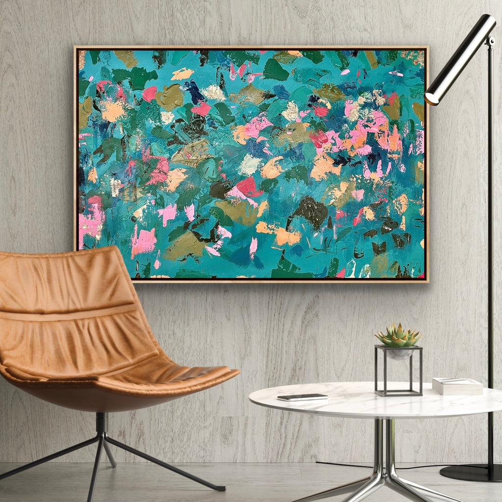 Painting comes unframed. Images showing framed painting are for mock up purposes only to provide the viewer with an idea as to what the painting will look like if framed in a shadow box frame (my personal preference is Oak however a White or Black shadow box frame will look good depending on your decor) if you have a preference for a framed piece.