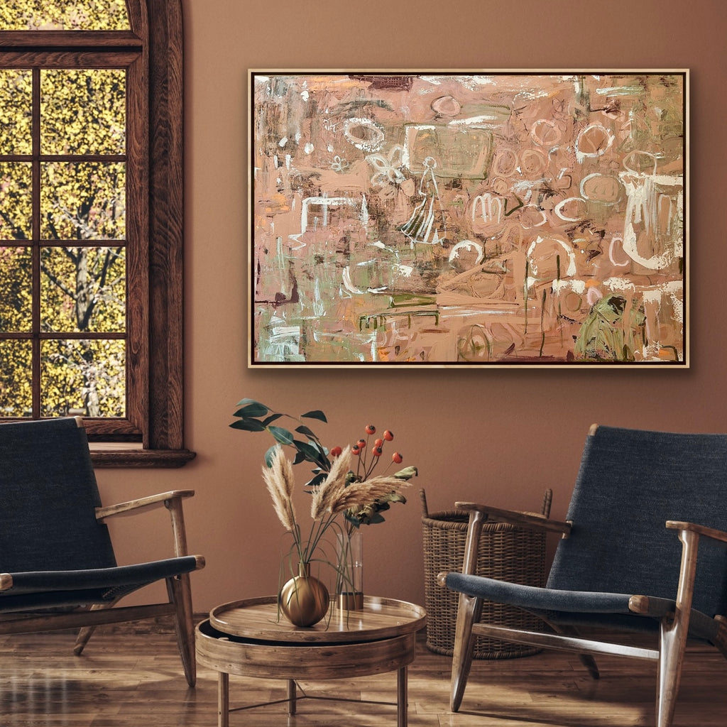 Painting comes unframed. Images showing framed painting are for mock up purposes only to provide the viewer with an idea as to what the painting will look like if framed in a shadow box frame (my personal preference is Oak however a White or Black shadow box frame will look good depending on your decor) if you have a preference for a framed piece.