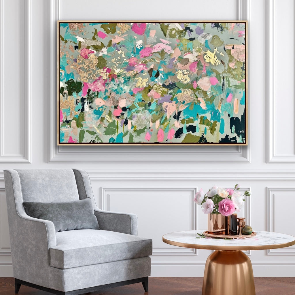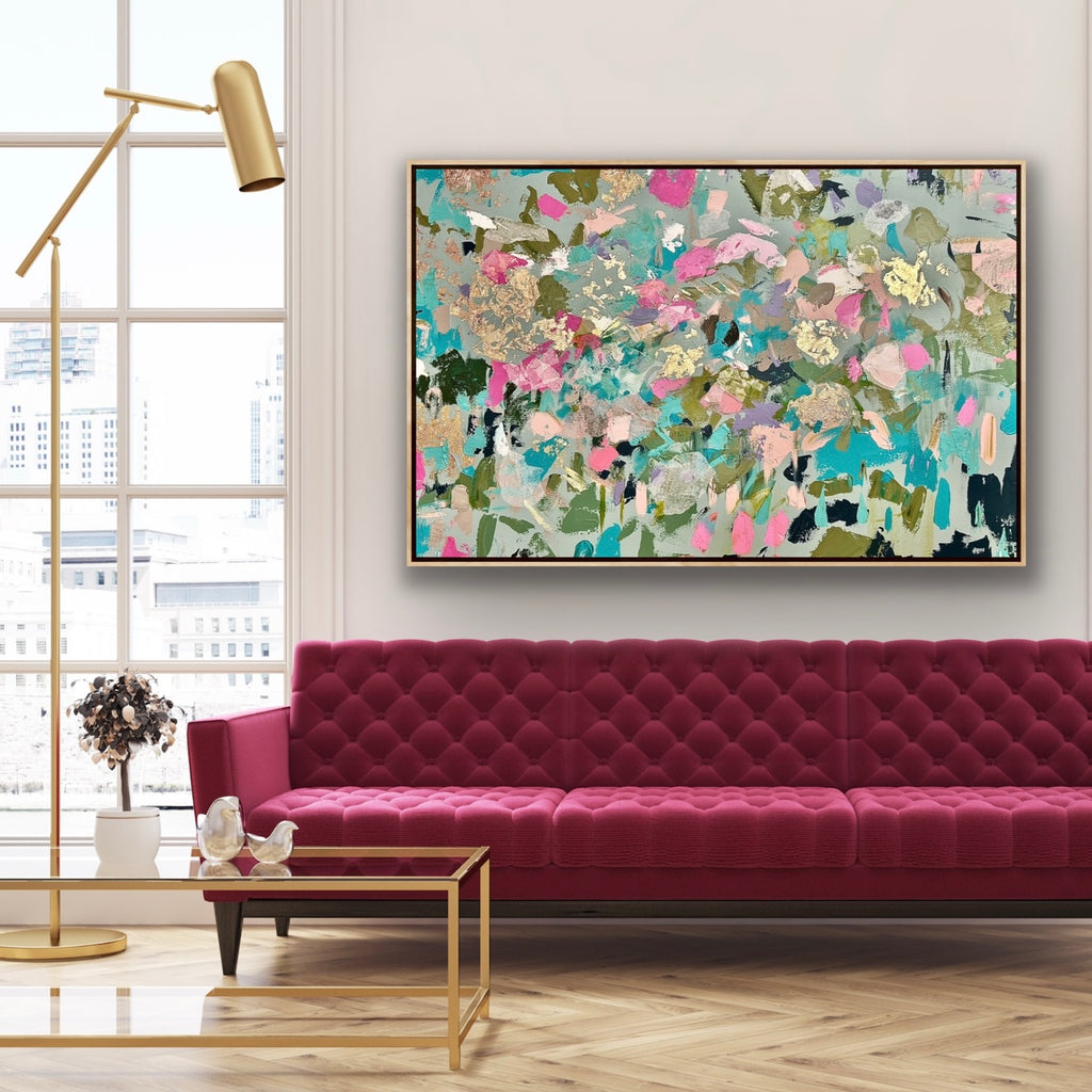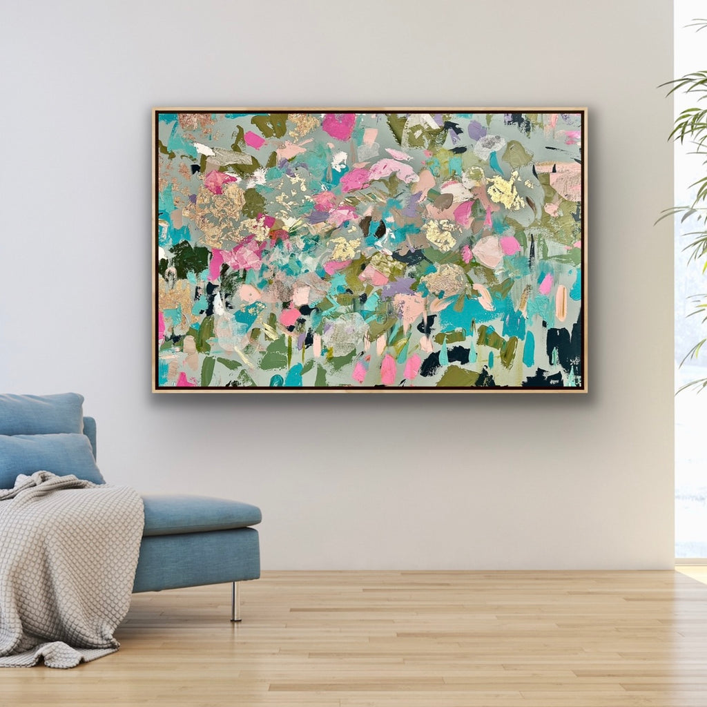 Painting comes unframed. Images showing framed painting are for mock up purposes only to provide the viewer with an idea as to what the painting will look like if framed in a shadow box frame (my personal preference is Oak however a White or Black shadow box frame will look good depending on your decor) if you have a preference for a framed piece.