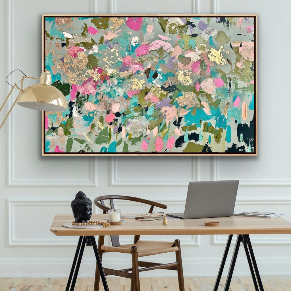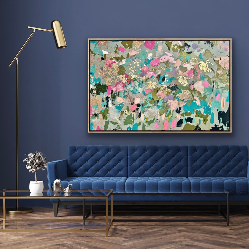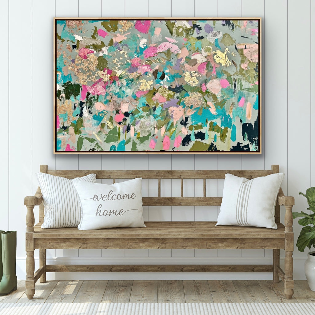 Painting comes unframed. Images showing framed painting are for mock up purposes only to provide the viewer with an idea as to what the painting will look like if framed in a shadow box frame (my personal preference is Oak however a White or Black shadow box frame will look good depending on your decor) if you have a preference for a framed piece.